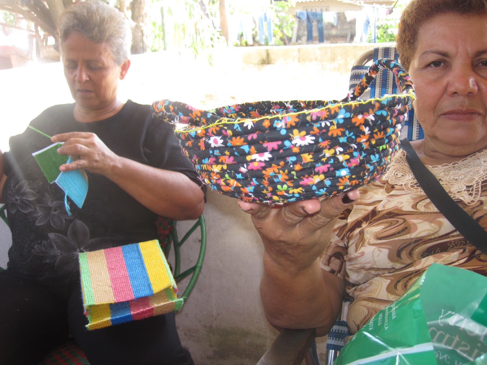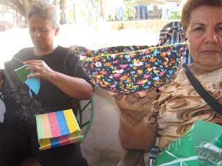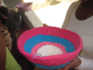 We made bags, decorations, and anything else that they wanted. One of the things however, that I think would be a good "cottage industry" for them is making coiled fabric baskets. I made a small one up and introduced them to it. Finding the cotton cording was somewhat of a challenge but once found, they were off and running. It is interesting because these women all know how to do things, they just need incentive and examples. I don't teach them step by step, but rather a general "this is how you do it", "these are the supplies", now use your imagination. And they do!
