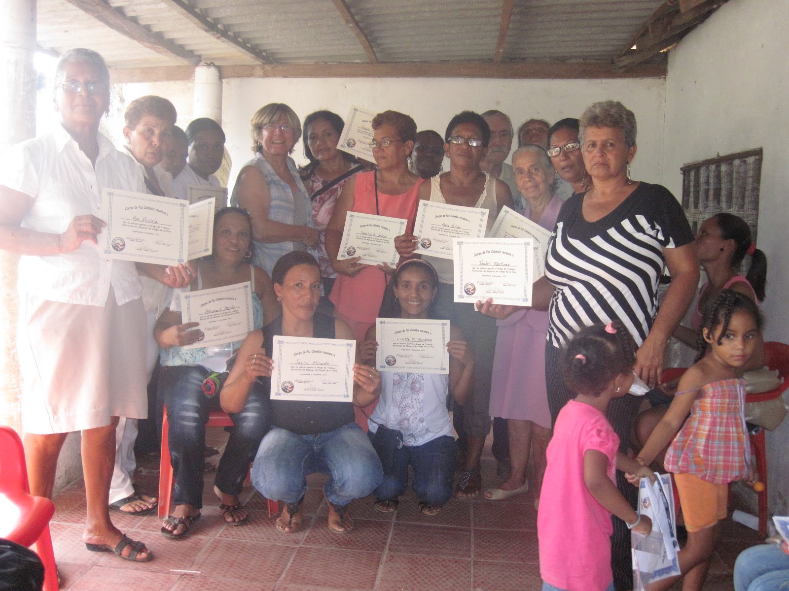 Along with the women came the proverbial niƱos or children. They accompany their mother wherever and whenever and as such we had to come up with activities for them. So, in essence, we are doing 2 distinct groups: women and children ranging in age from 3 to 15, all like sponges, soaking up whatever we have given them. We started with simple coloring and went on to making ornaments, FruitLoop jewelry, popsicle stick items, paper chains, hats and boats, to name a few. And of course, at the end of it all, certificates of attendance for all with potato salad with chicken, cake and soda. All held together with a promise that the "tallers" or workshops will continue in the new year.